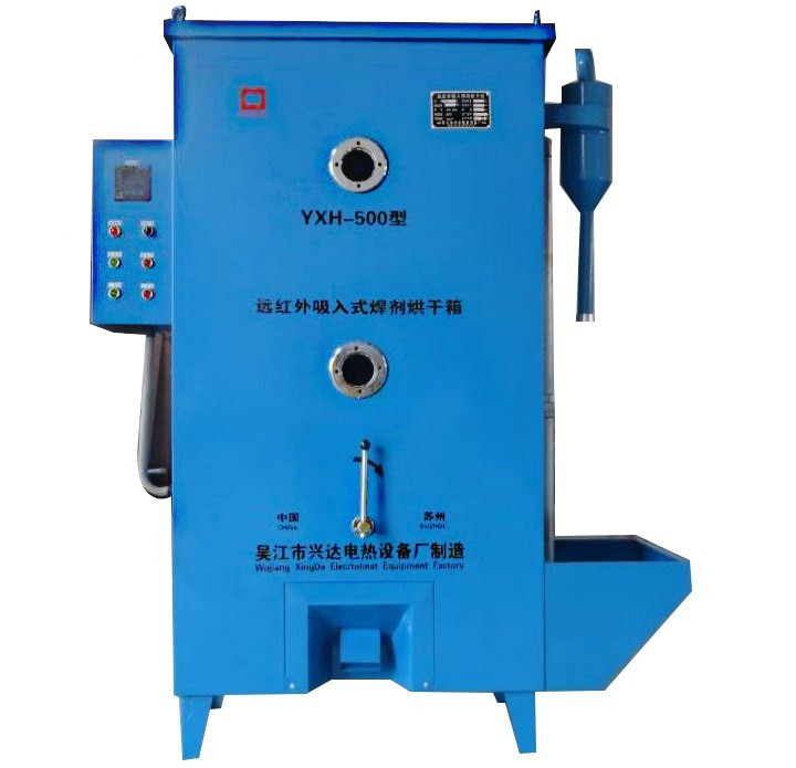 YXH型鼓風型內熱式自動焊焊劑烘箱 概述: YXH型鼓風型內熱式自動焊焊劑烘箱是埋弧自動焊劑專用設備,配有吸料裝置,可將焊劑自動吸入箱內,還能去除、收集其中的粉塵,不銹鋼遠紅外電熱元件均分布于烘室內,確保了焊劑受熱均勻。設有自動控溫裝置,經烘干的焊劑含水量低于0.1%,工作溫度500℃。